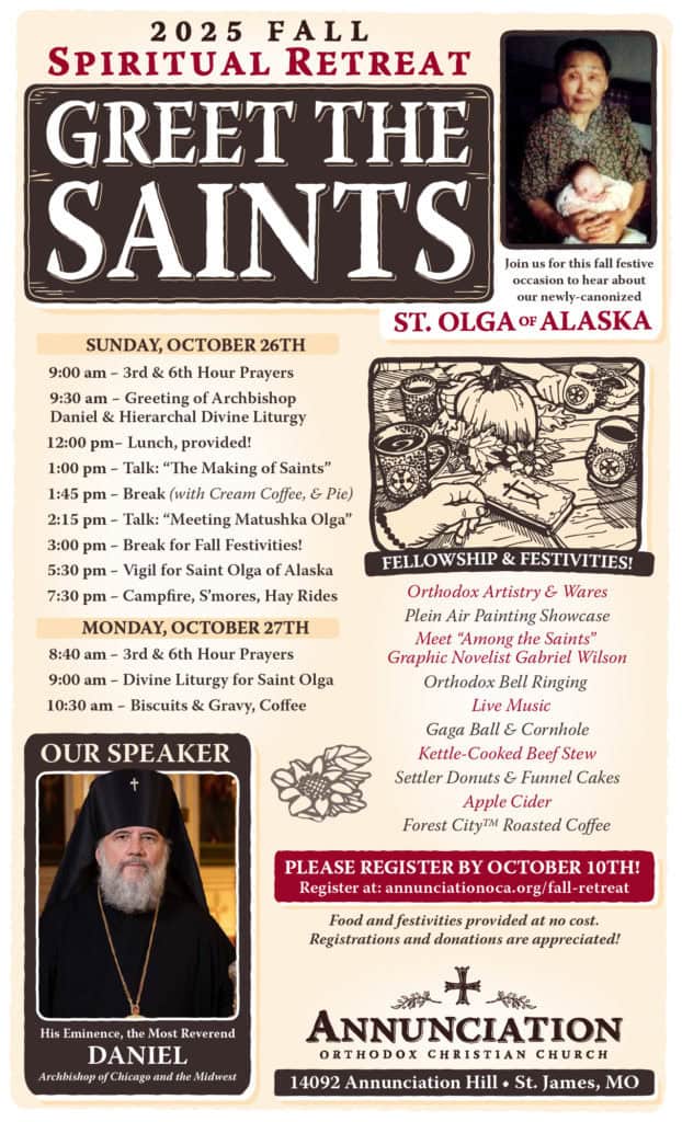 For over 10 years at Annunciation we have held a free fall retreat where we invite guest speakers to come and give a talk on a particular spiritual topic. This year, we are very honored to host His Eminence, Archbishop Daniel who is coming to give our retreat entitled: